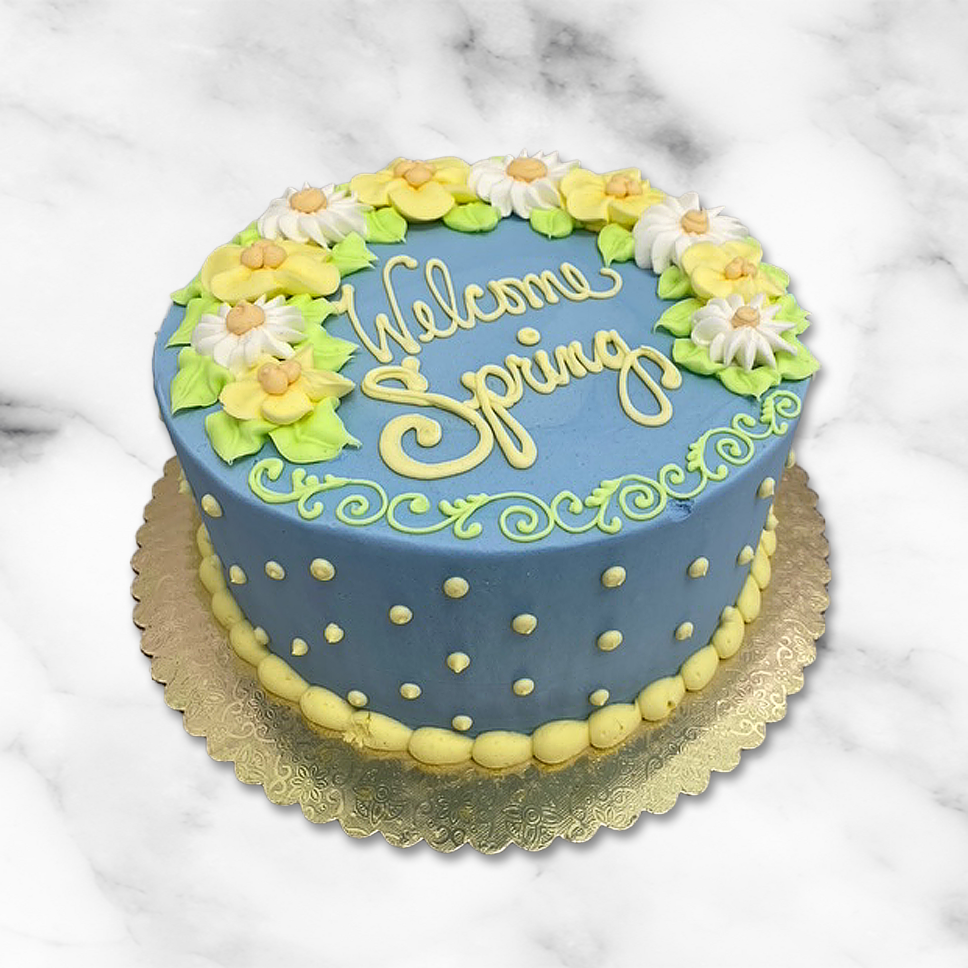 Welcome spring with this light blue and yellow cake decorated with white and yellow flowers.